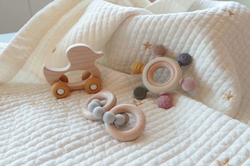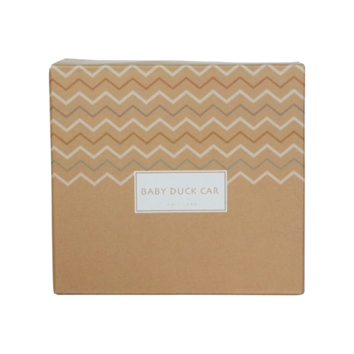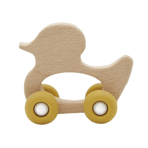 以天然木頭的原色搭上黃色矽膠的滾輪胎,來設計可愛鴨寶寶造型