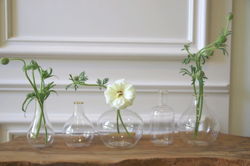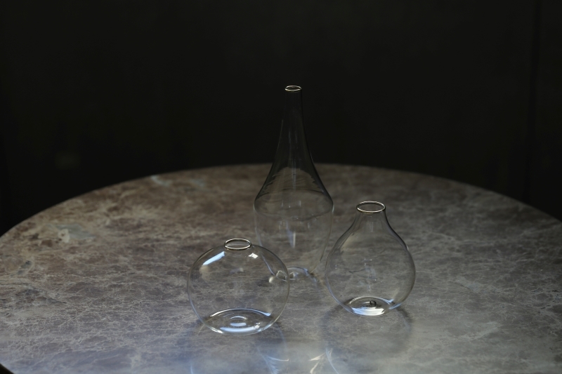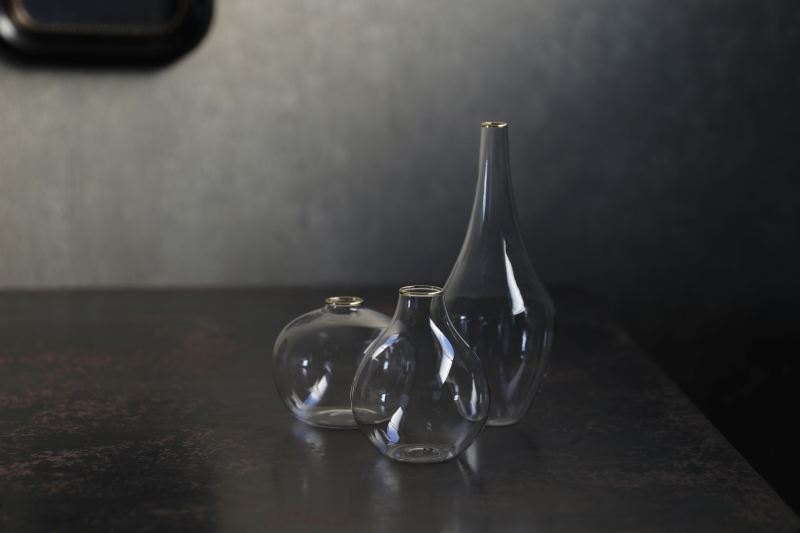 花器整體清澈透明,搭配金色的瓶口,營造出優雅的氣息