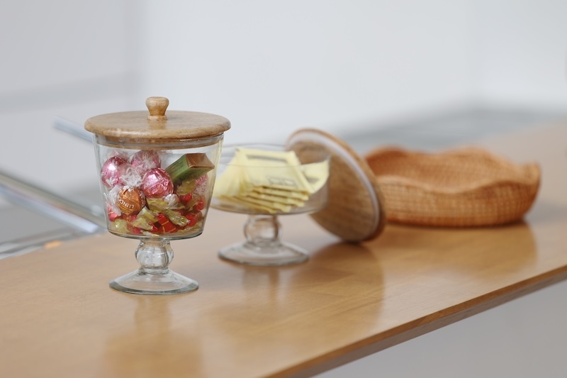 在玻璃器皿中,放入糖果或巧克力,並蓋上木頭蓋作為保護,讓人有一種奢華的感覺。