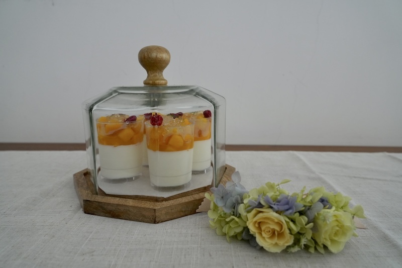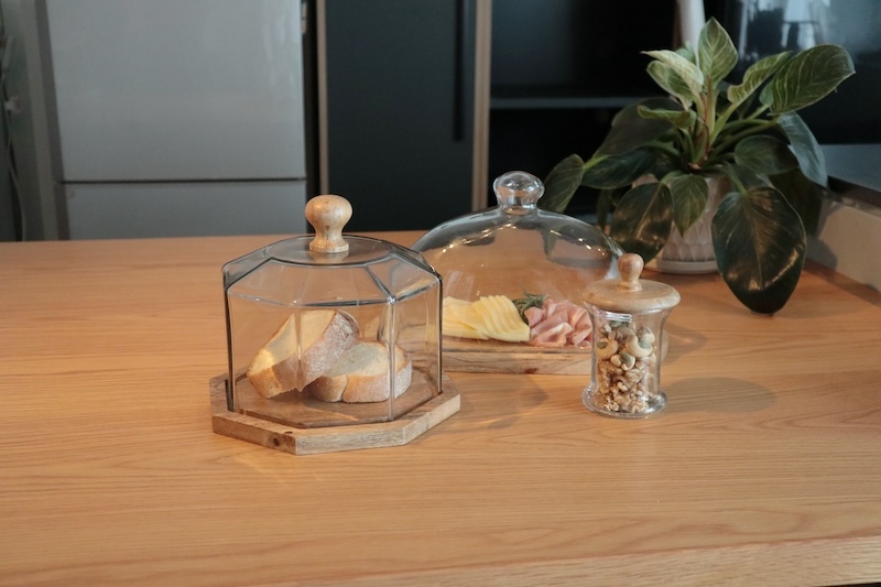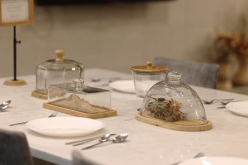 手工製作的玻璃手拿蓋,除了保護食物之外,也為餐桌增添平靜及溫暖的氛圍